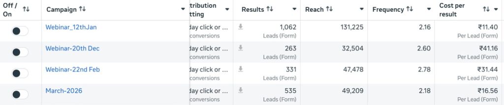 The campaign combined a webinar funnel strategy with direct conversion campaigns targeting warm audiences, ensuring both engagement and higher conversion rates.